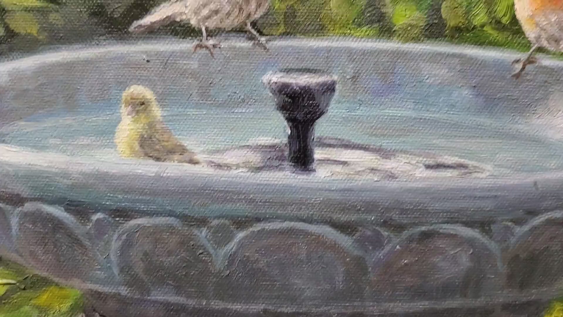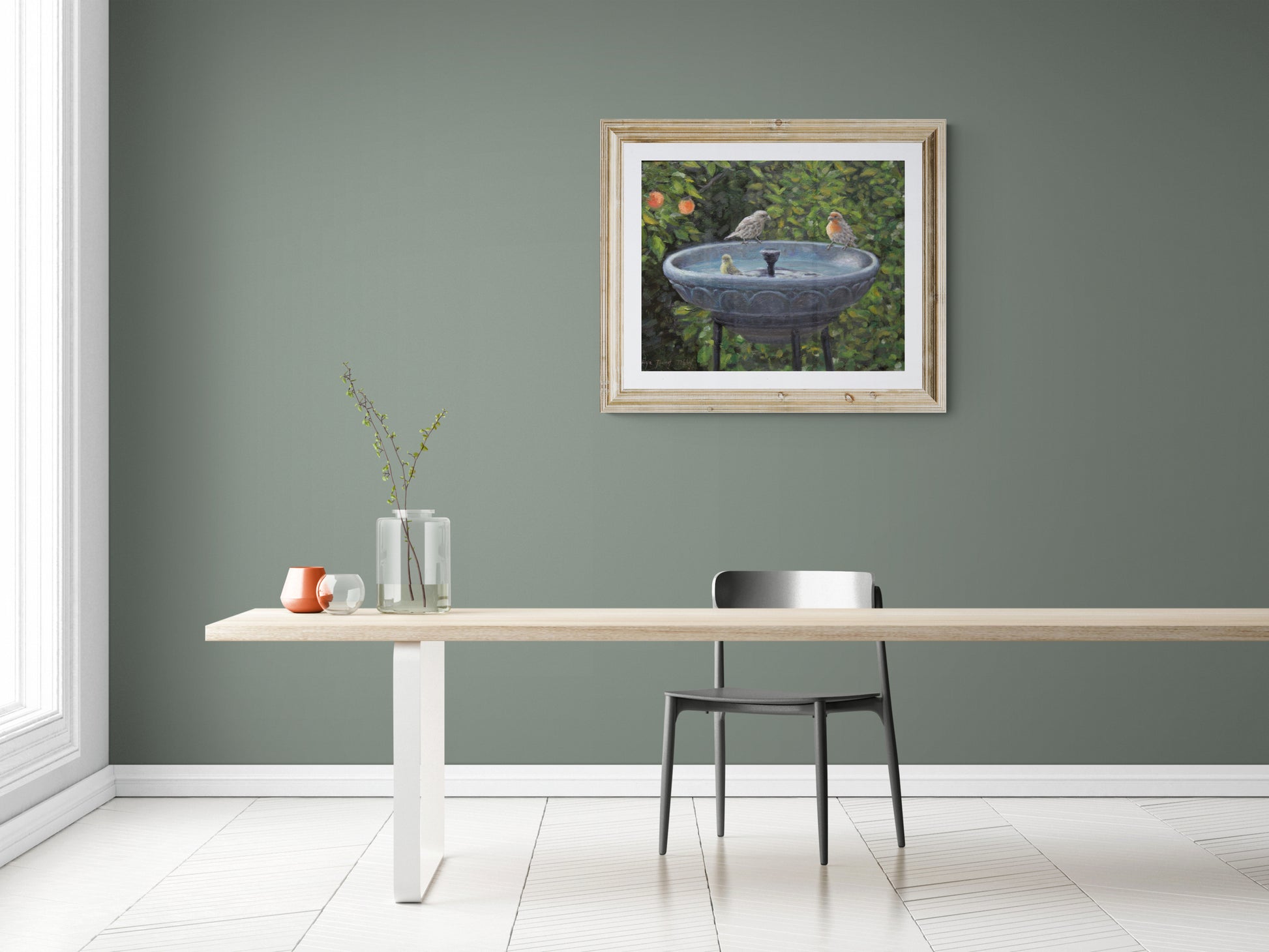 A serene garden scene captures the delicate charm of nature's smallest visitors. Sparrows and a golden finch gather around a birdbath, their feathered forms rendered with meticulous attention to detail. The composition balances realism with painterly brushwork, creating an inviting atmosphere that celebrates the quiet beauty of backyard wildlife. Perfect for those who appreciate both artistic technique and the gentle wonder of avian life.