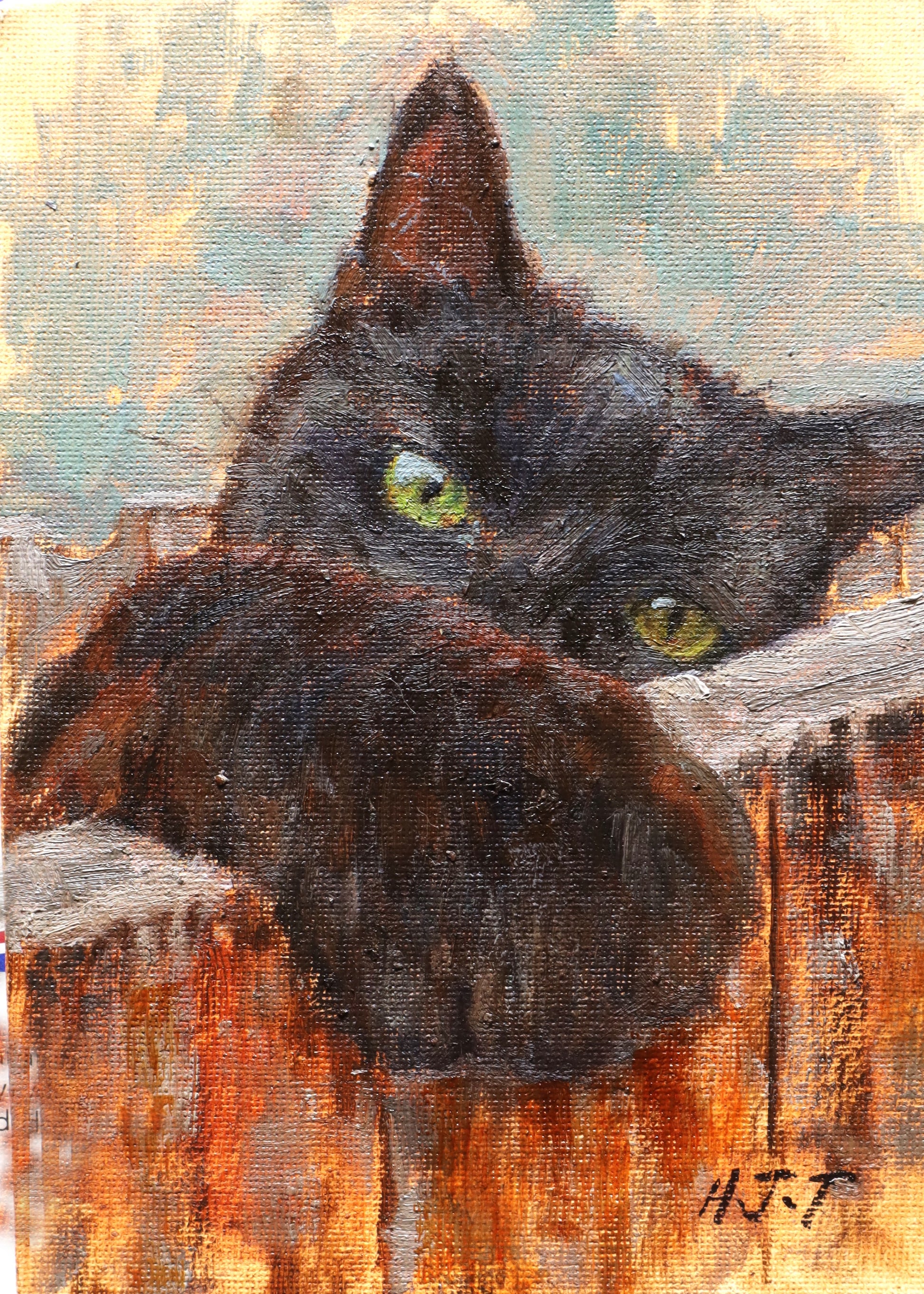 This intimate 5"x7" original painting captures a black cat in a moment of gentle engagement, its paw raised with endearing curiosity. The artist employs a refined technique that merges photorealistic rendering with impressionistic sensibility, allowing light to dance across the subject's form. The cat's penetrating gaze—tender yet alert—becomes the emotional anchor of the composition. A distinguished piece for collectors who seek artwork that demonstrates both technical mastery and the ability to convey quiet narrative within a compact format.