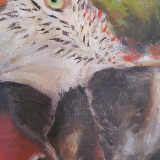 This vibrant oil painting captures a lively parrot savoring a nut, brought to life with brilliant, realistic brushstrokes by HJT. The bright colors and playful detail make it feel as if the bird might flutter off the canvas at any moment, adding a burst of joyful energy to any space.