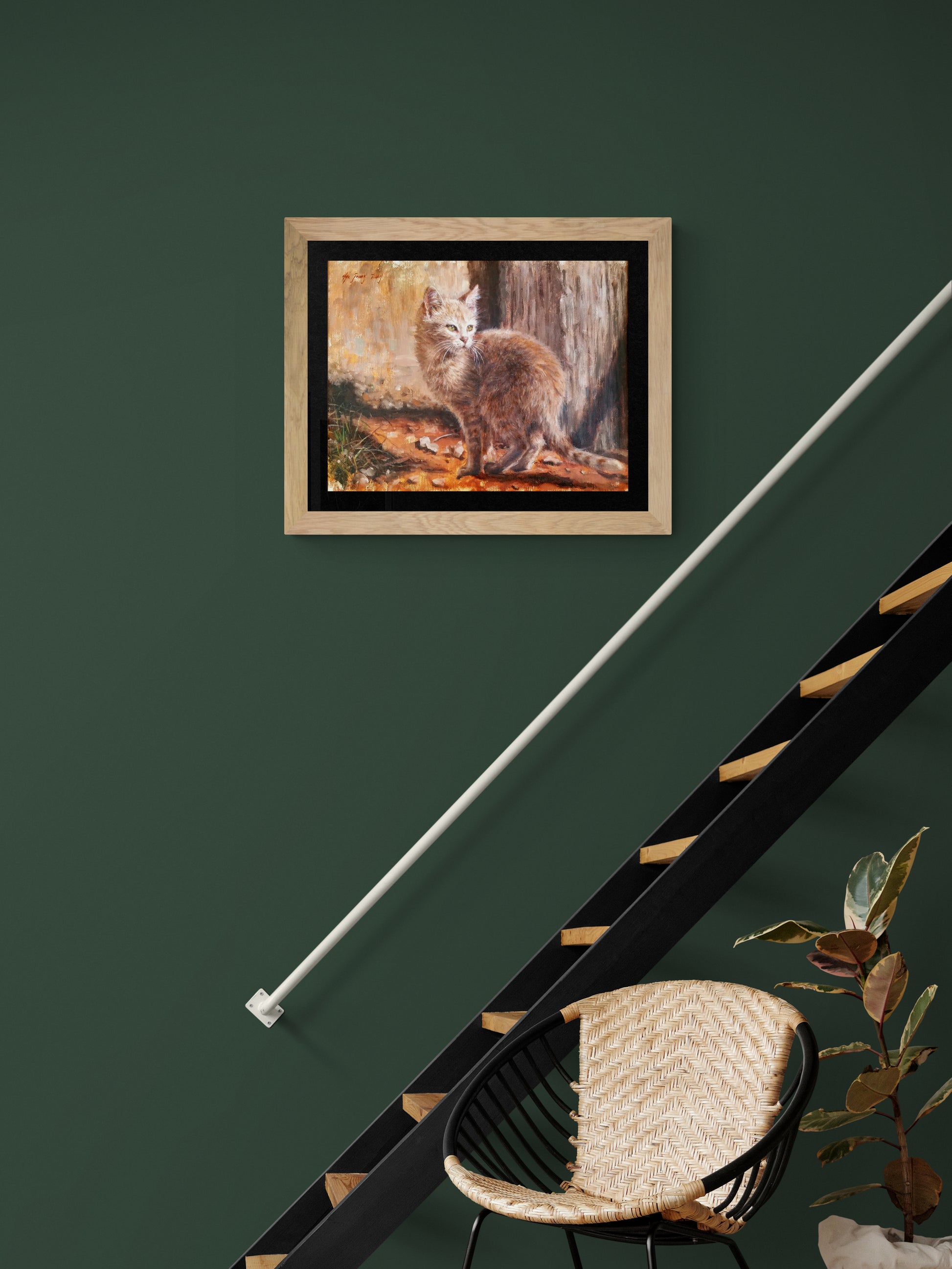 This oil painting captures the raw emotion of a young feral orange cat in a moment of being alert The artist skillfully portrays the cat’s tense posture and alert eyes, conveying its instinctive wariness. The vivid orange hues contrast with the darker background, emphasizing the cat’s vulnerability. This piece invites viewers to connect with the untamed spirit of the feline world.